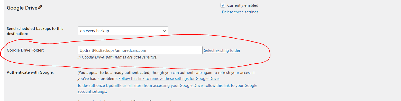 - Google Drive location: Files will be saved under the dev@ampv.com Google Drive. There is a parent folder named “UpdraftPlusBackups”, and under this parent folder please add a new folder for every website we add with the domain name i.e. “domain.com”